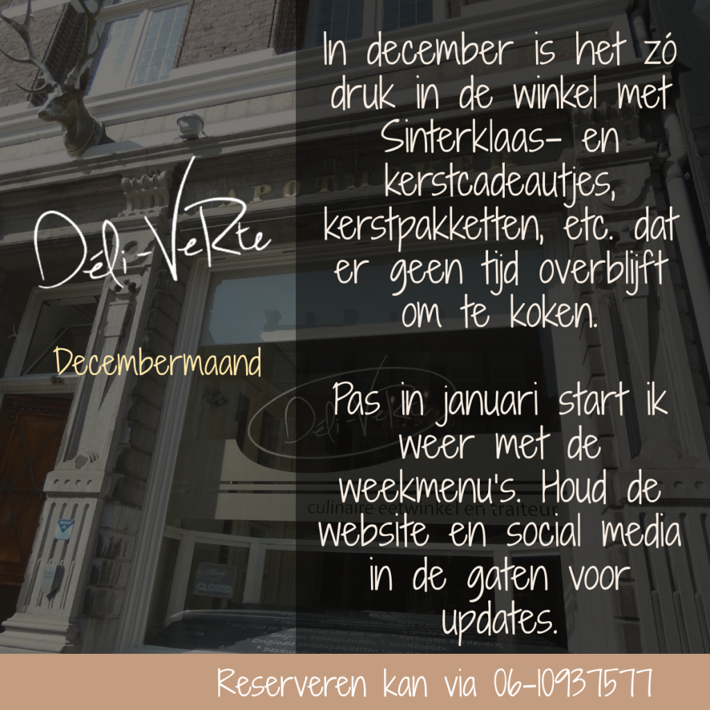 Ik maak de gerechten pas op de dag zelf. Je kunt het dus pas komen afhalen vanaf 12.30 uur!